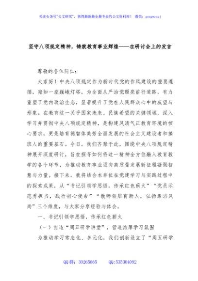 / 在学校研讨会上的发言:坚守八项规定精神,铸就教育事业辉煌