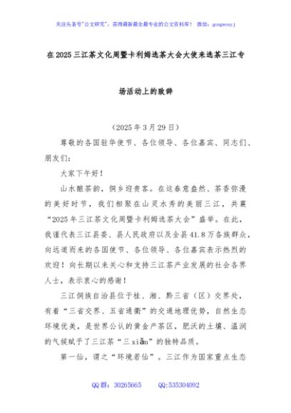 / 在2025三江茶文化周暨卡利姆选茶大会大使来选茶三江专场活动上的致辞