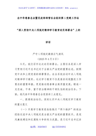 / 在中华慈善总会暨民政部部管社会组织第二党建工作站“深入贯彻中央八项规定精神学习教育动员部署会”上的讲话