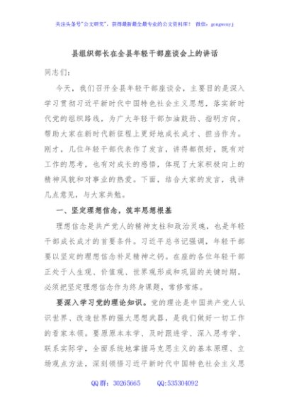 / 县组织部长在全县年轻干部座谈会上的讲话