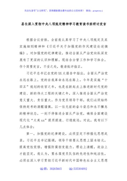 / 县长深入贯彻中央八项规定精神学习教育读书班研讨发言