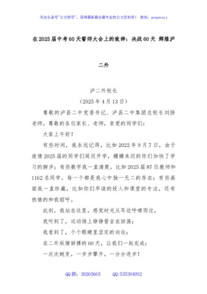 / 在2025届中考60天誓师大会上的致辞:决战60天 辉煌泸二外
