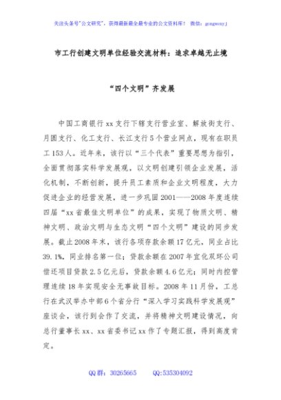 / 市工行创建文明单位经验交流材料:追求卓越无止境 “四个文明”齐发展