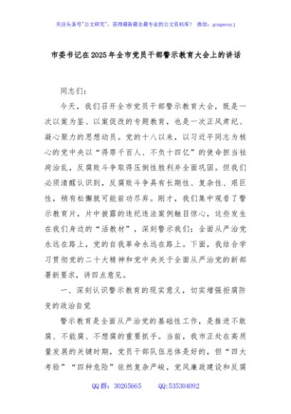 / 市委书记在2025年全市党员干部警示教育大会上的讲话