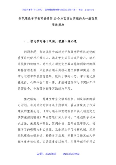 / 作风建设学习教育查摆的10个方面突出问题的具体表现及整改措施