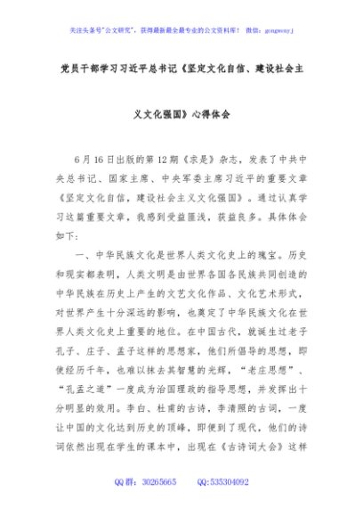 / 党员干部学习习近平总书记《坚定文化自信、建设社会主义文化强国》心得体会