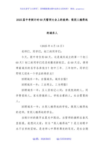 / 2025届中考倒计时60天誓师大会上的致辞:做别人瞧得起的城东人