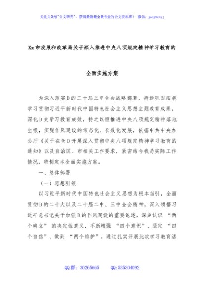 / Xx市发展和改革局关于深入推进中央八项规定精神学习教育的全面实施方案