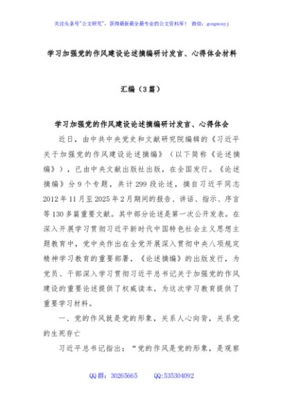 / (3篇)学习加强党的作风建设论述摘编研讨发言、心得体会材料汇编