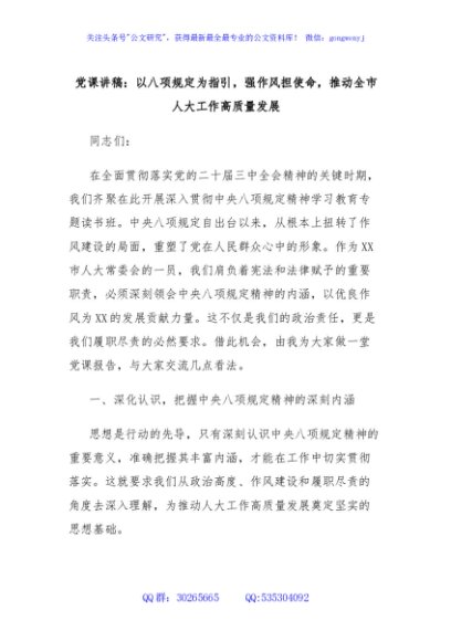 / 党课讲稿:以八项规定为指引,强作风担使命,推动全市人大工作高质量发展