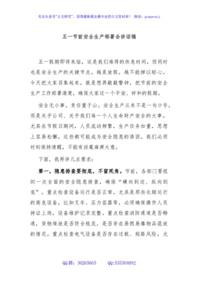 / 五一节前安全生产部署会讲话稿