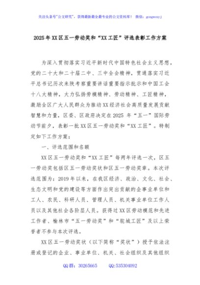 / 2025年XX区五一劳动奖和“XX工匠”评选表彰工作方案