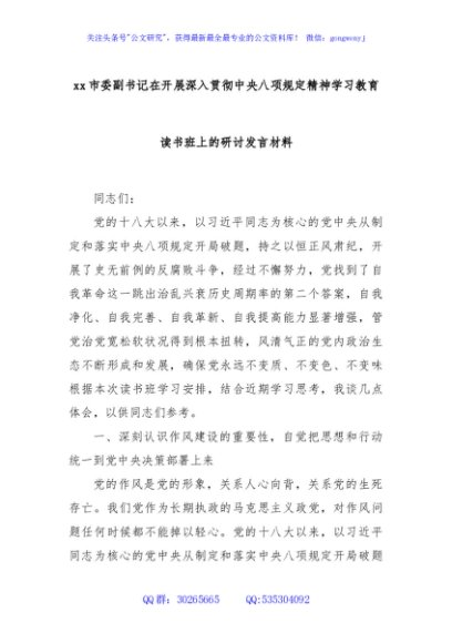 / xx市委副书记在开展深入贯彻中央八项规定精神学习教育读书班上的研讨发言材料