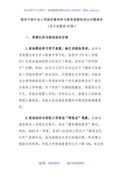 / 领导干部中央八项规定精神学习教育查摆的突出问题清单(五个方面共15条)