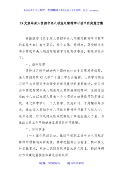 / XX文旅局深入贯彻中央八项规定精神学习读书班实施方案
