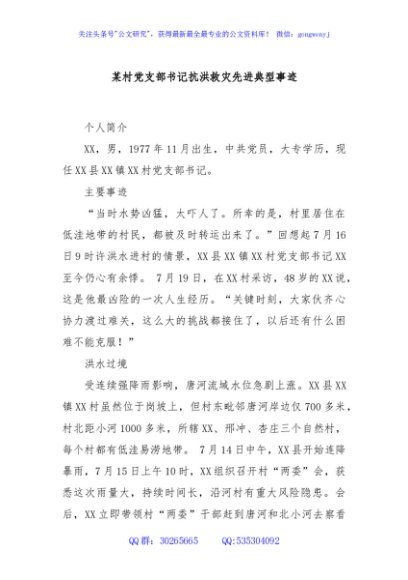 / 某村党支部书记抗洪救灾先进典型事迹