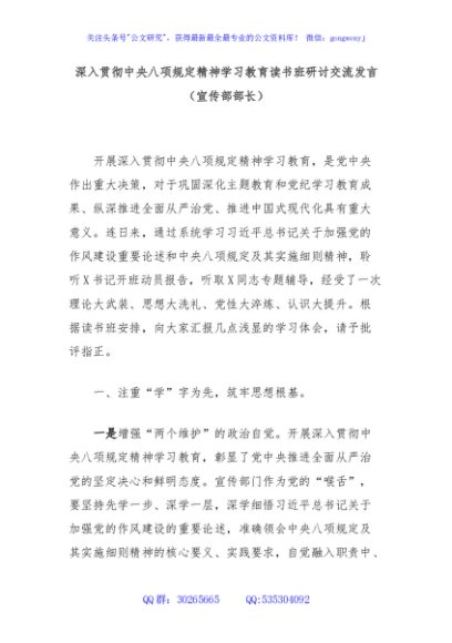 / 深入贯彻中央八项规定精神学习教育读书班研讨交流发言(宣传部部长)