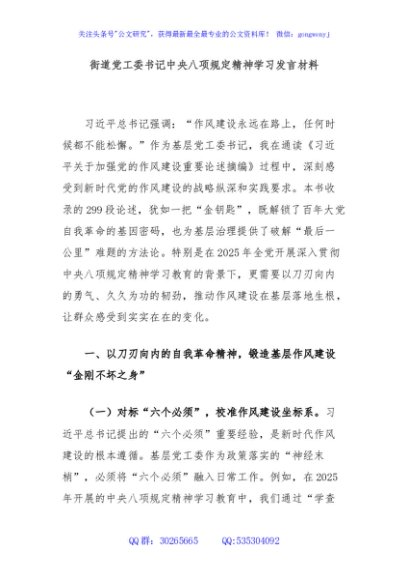 / 街道党工委书记中央八项规定精神学习发言材料