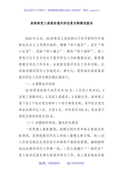 / 某街道党工委落实意识形态责任制情况报告