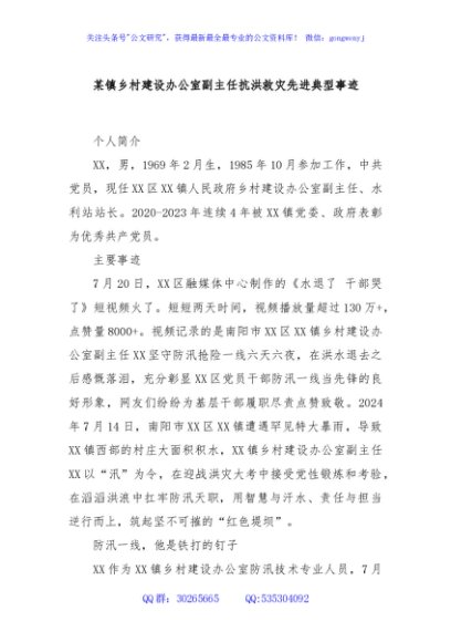 / 某镇乡村建设办公室副主任抗洪救灾先进典型事迹