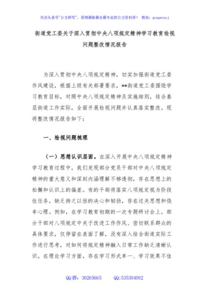 / 街道党工委关于深入贯彻中央八项规定精神学习教育检视问题整改情况报告