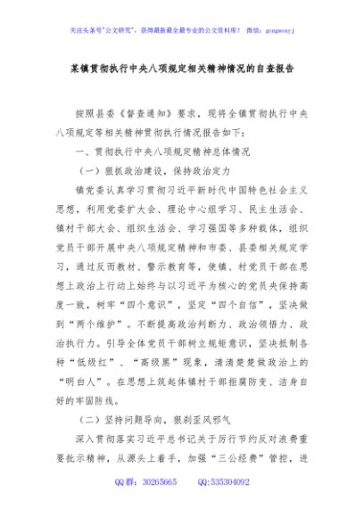 / 某镇贯彻执行中央八项规定相关精神情况的自查报告