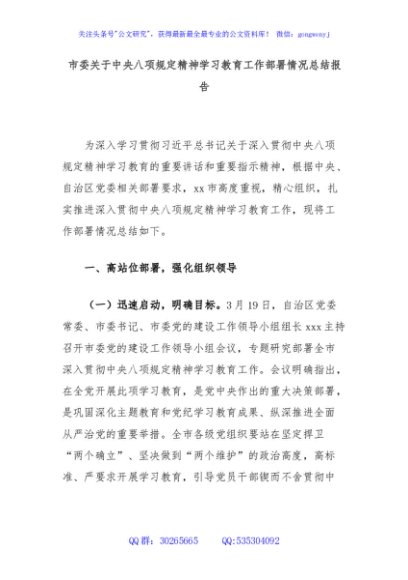 / 市委关于中央八项规定精神学习教育工作部署情况总结报告