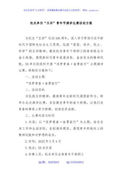 / 机关单位“五四”青年节演讲比赛活动方案