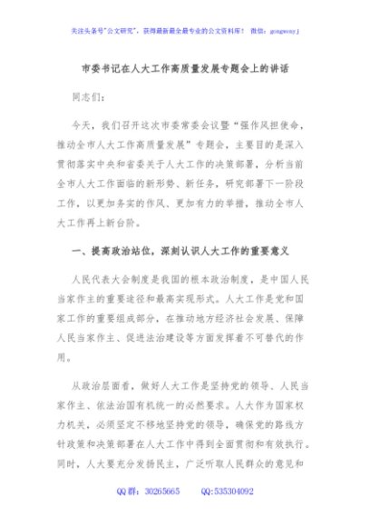 / 市委书记在人大工作高质量发展专题会上的讲话