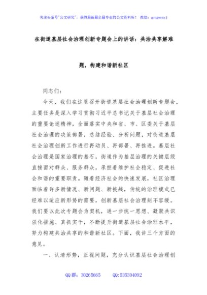 / 在街道基层社会治理创新专题会上的讲话:共治共享解难题,构建和谐新社区