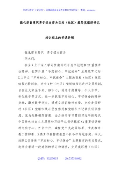 / 强化宗旨意识勇于担当作为在村(社区)基层党组织书记培训班上的党课讲稿