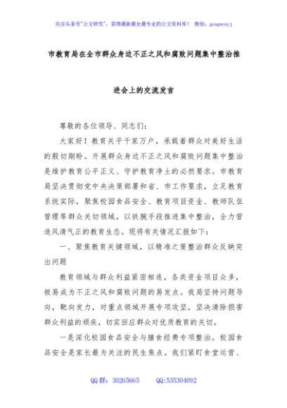 / 市教育局在全市群众身边不正之风和腐败问题集中整治推进会上的交流发言