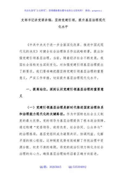 / 支部书记讲党课讲稿:坚持党建引领,提升基层治理现代化水平
