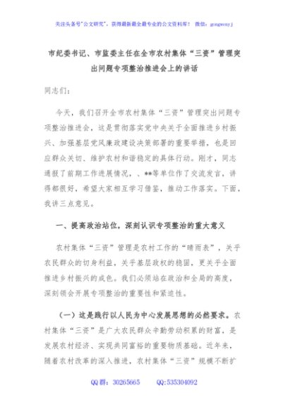 / 市纪委书记、市监委主任在全市农村集体“三资”管理突出问题专项整治推进会上的讲话
