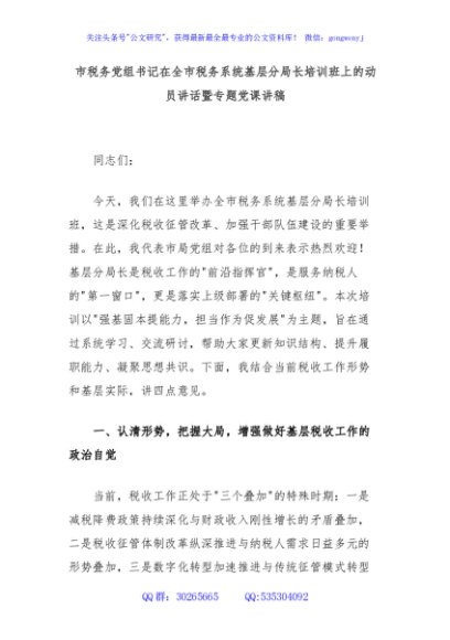 / 市税务党组书记在全市税务系统基层分局长培训班上的动员讲话暨专题党课讲稿