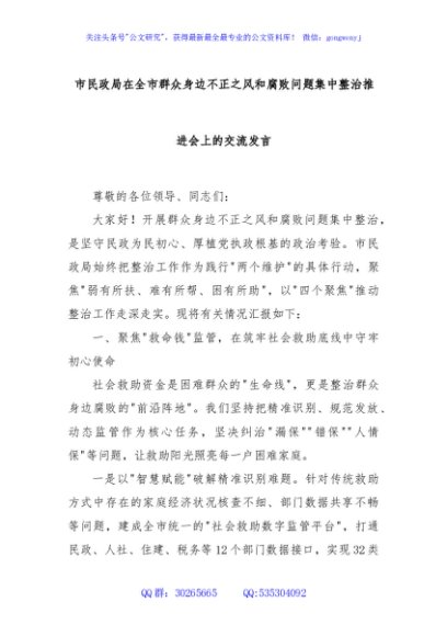 / 市民政局在全市群众身边不正之风和腐败问题集中整治推进会上的交流发言