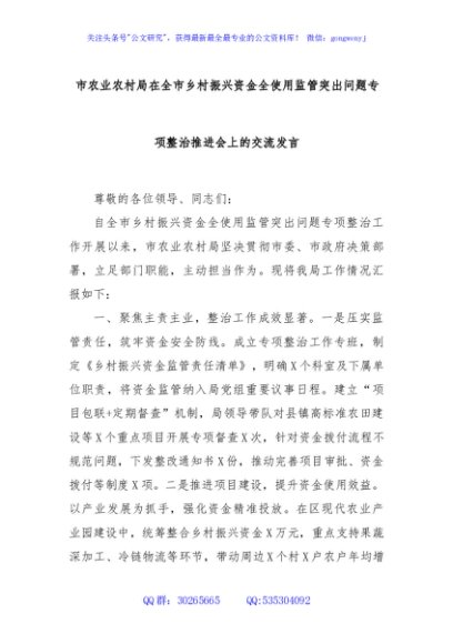 / 市农业农村局在全市乡村振兴资金全使用监管突出问题专项整治推进会上的交流发言