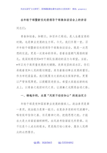 / 在年轻干部暨新任处级领导干部集体谈话会上的讲话
