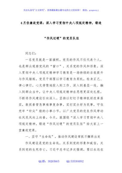 / 4月份廉政党课:深入学习贯彻中央八项规定精神,锻造“作风过硬”的党员队伍