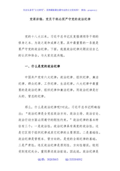 / 党课讲稿:党员干部必须严守党的政治纪律
