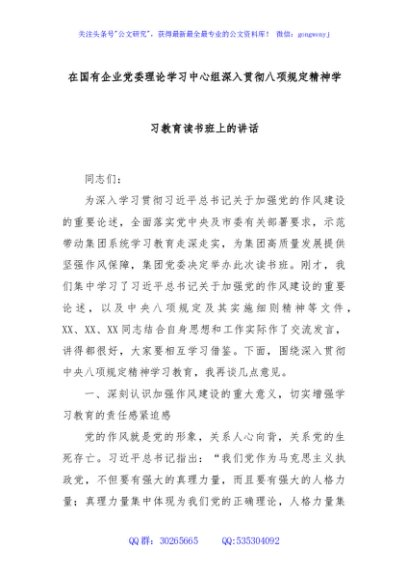 / 在国有企业党委理论学习中心组深入贯彻八项规定精神学习教育读书班上的讲话