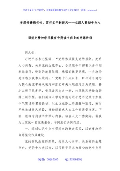 / 学深悟透强党性,笃行实干树新风——在深入贯彻中央八项规定精神学习教育专题读书班上的党课讲稿
