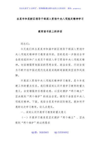 / 在某市和某新区领导干部深入贯彻中央八项规定精神学习教育读书班上的讲话