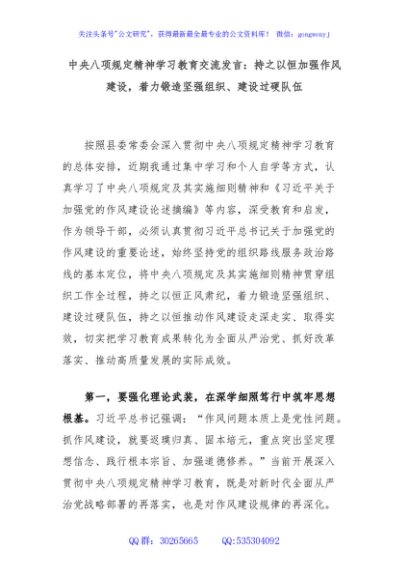 / 中央八项规定精神学习教育交流发言:持之以恒加强作风建设,着力锻造坚强组织、建设过硬队伍