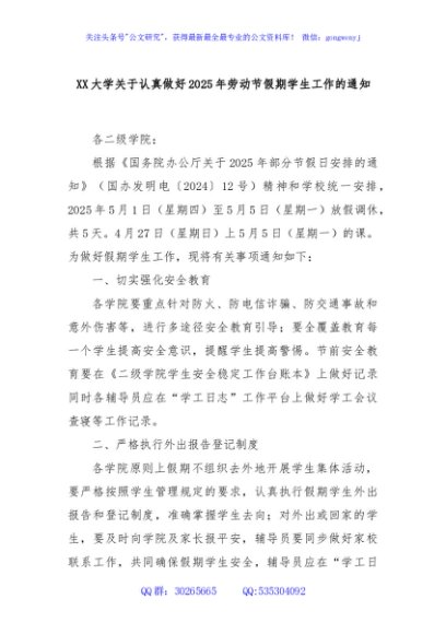 / XX大学关于认真做好2025年劳动节假期学生工作的通知
