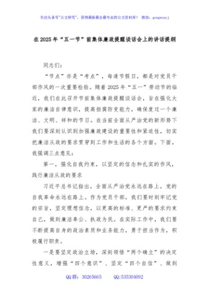 / 在2025年“五一节”前集体廉政提醒谈话会上的讲话提纲