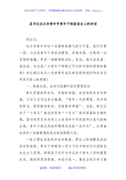/ 县书记在五四青年节青年干部座谈会上的讲话