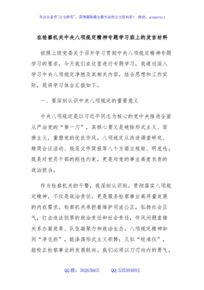 / 在检察机关中央八项规定精神专题学习班上的发言材料