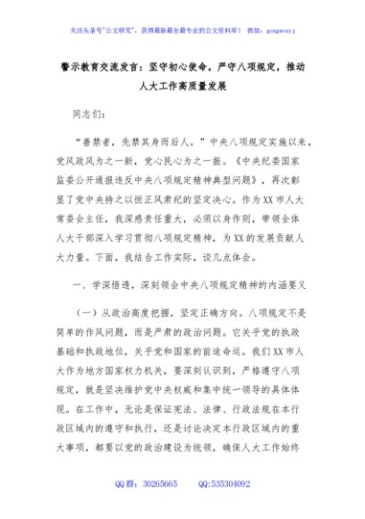 / 警示教育交流发言:坚守初心使命,严守八项规定,推动人大工作高质量发展