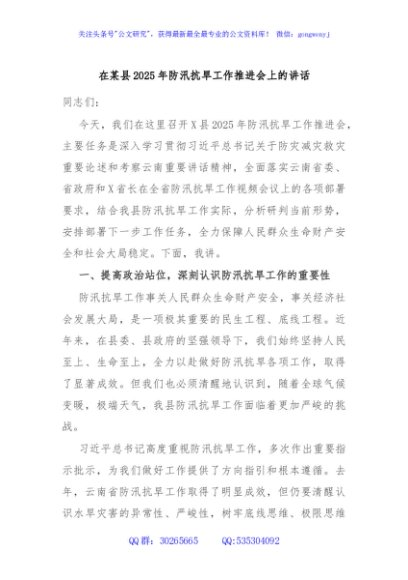 / 在某县2025年防汛抗旱工作推进会上的讲话